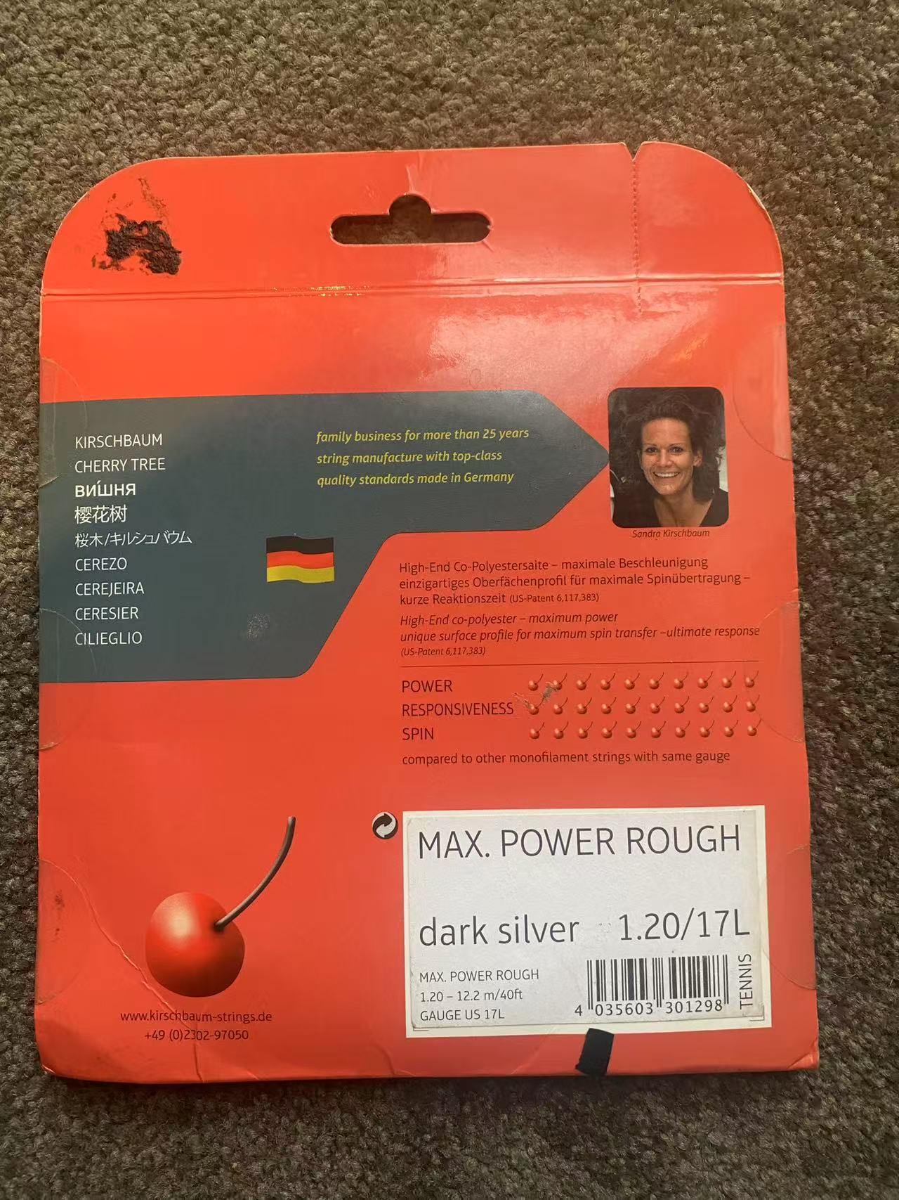 Kirschbaum MAX POWER tennis string is made for the advanced player (small sweetspot). It is a monofilament polyester string with a mixture of the latest technology with maximum power, but easy to control. The Kirschbaum Max Power has a very short pocketing time, fast ball reaction and quite good feeling.