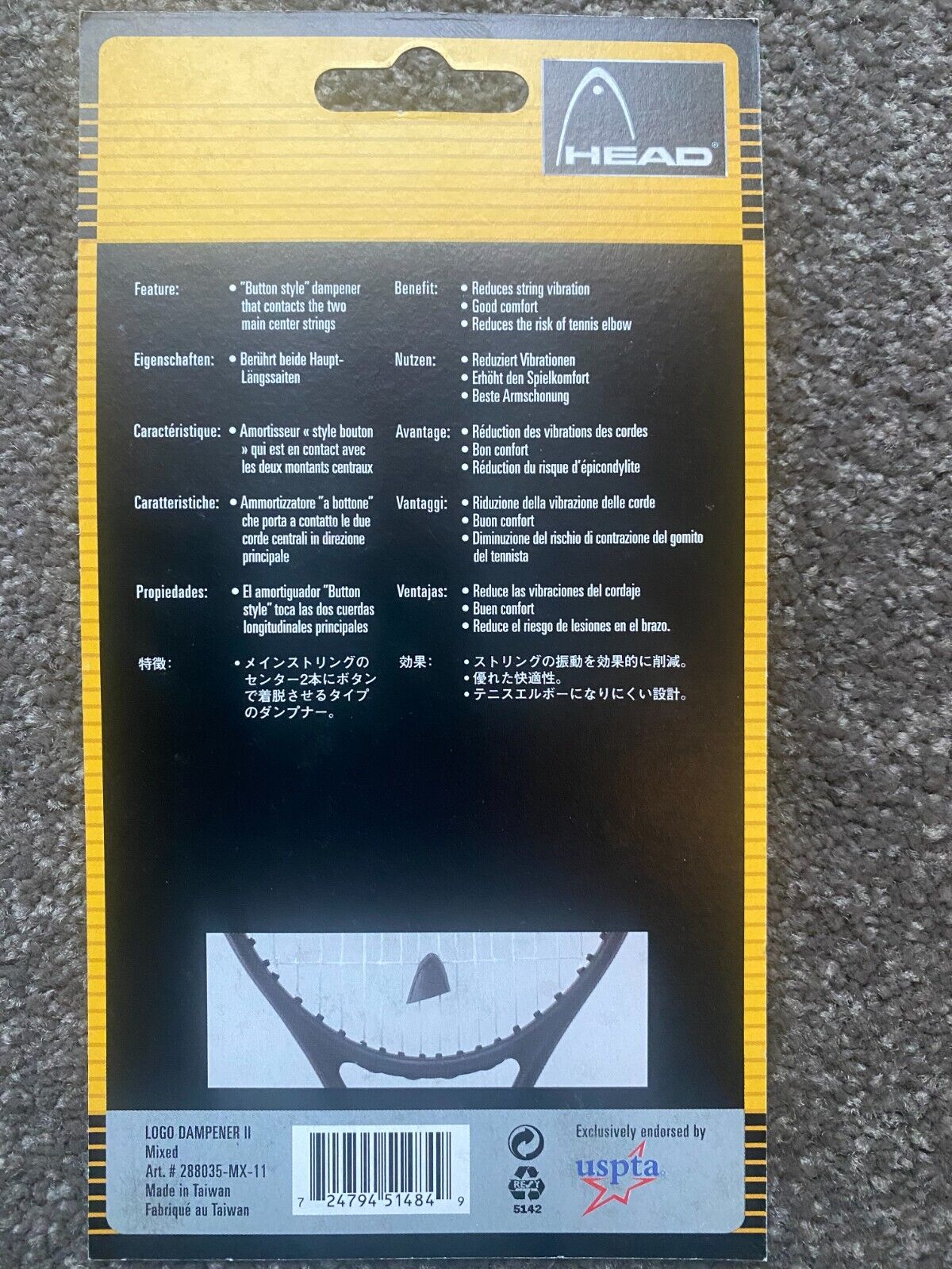 Head LOGO Dampener II Vibration Dampener 2-piece pack is crafted of silicone material in classic black. It is unisex-adult and ideal for tennis. The product dimensions are 15x10x2 cm and weighs 3.72 grams.