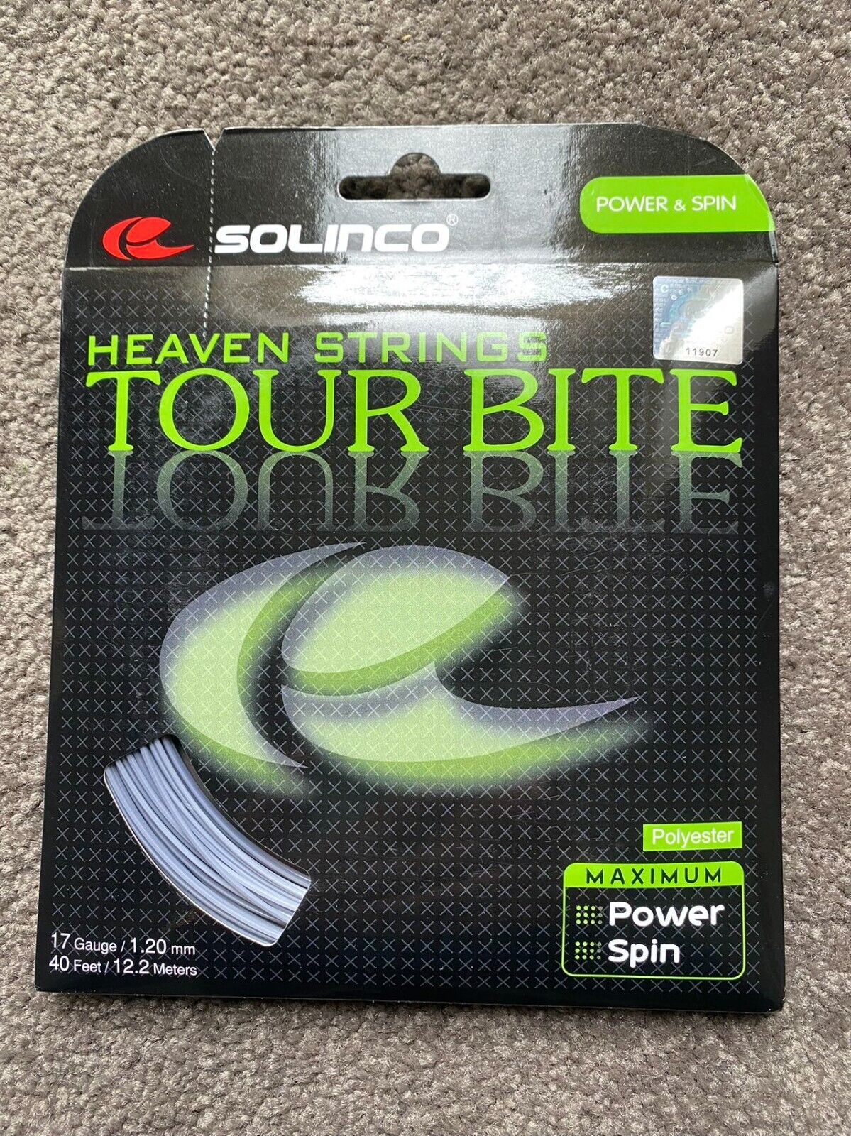 Solinco Tour Bite is a strong and enduring co-polyester designed for players who generate a lot of power and spin in their strokes. It has become increasingly popular among collegiate players who need precise control at higher head speeds. Our testers noticed its square profile's ability to grip the ball. This string's low power rate allows powerful players to add plenty of head speed and responds to hard shots from odd angles. When played by capable hands, Tour Bite creates a powerful ball. Size: 17/1.20mm Length: 40ft/12.2m Material: Co-polyester Color: Silver