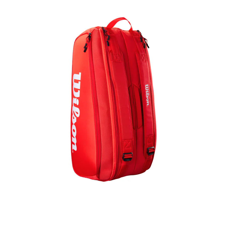 Superior quality, tennis-oriented functionality and classic design collide: introducing Wilson's latest Super Tour bag collection. This bag comprises three main compartments that hold up to 9 rackets, two large exterior side pockets and a dual carry system for optimal transportation. New to the line are reinforced side panels, which provide extra durability at spots that typically rip first. Tennis players will also appreciate the Thermoguard lining in one main compartment that protects contents wilting from extreme heat.